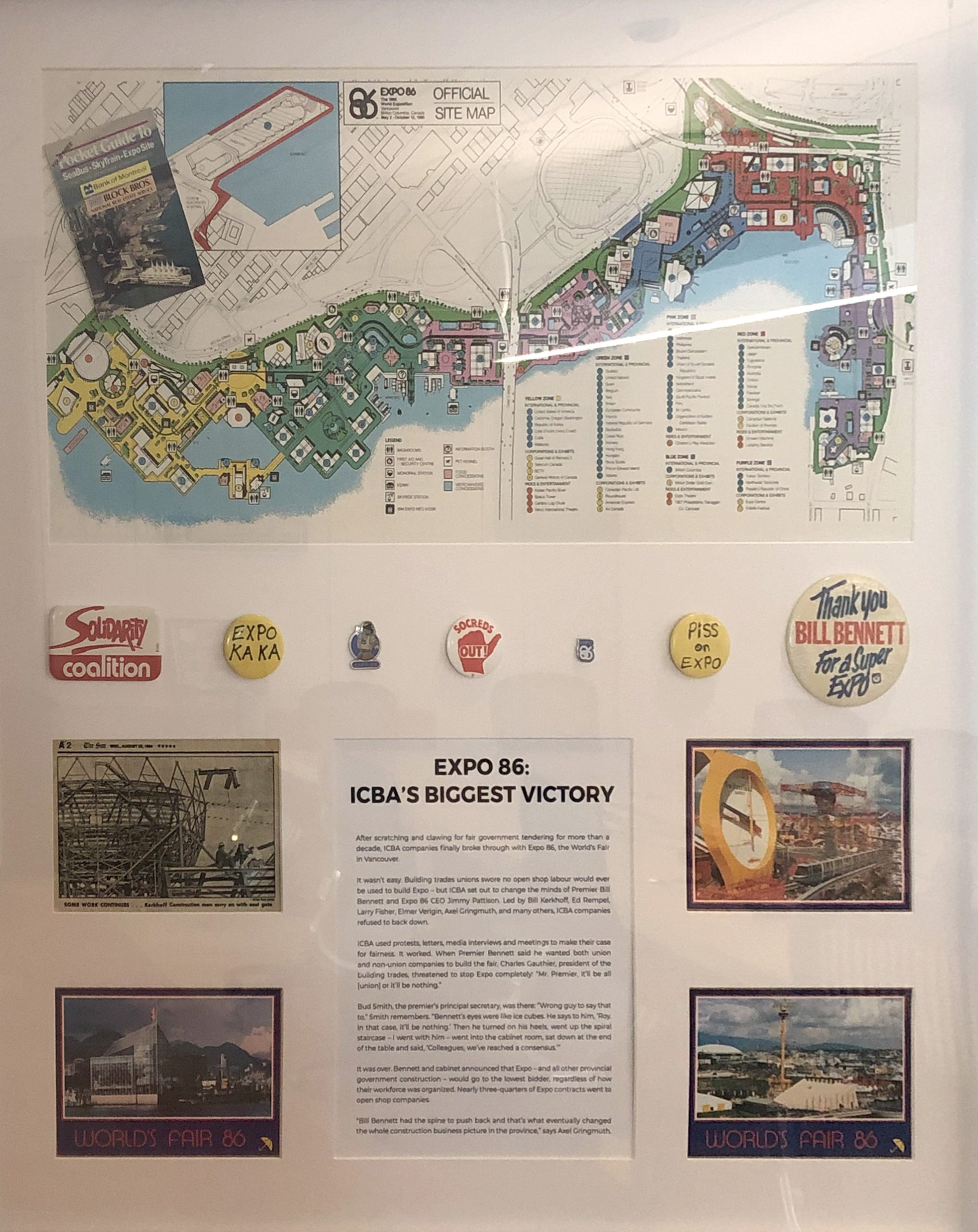 Meanwhile, the open shop sector was mobilizing. Various meetings took place between Expo and key contractors, albeit very discretely. Myrtle-Anne Rempel’s husband Ed Rempel was among those involved. She recalls him being asked to come for a meeting with Jimmy Pattison, with the further suggestion that he get off the elevator two floors below and then take the stairs. “We didn’t openly meet with anybody,” Fisher said. But they were making headway: “You kept progressing and showing them that, ‘yes, we’ve got that… yes, this is how we’ll do it.’ So it was a matter of building a relationship, collaborating and just steadily moving forward.” Pattison and the Expo organization were coming to have a greater appreciation of what the open shop sector could bring to Expo. Wilson Beck, then chairman of the BC Construction Association, provided his input to Pattison on how that capacity could be accessed: “We started to talk about the tendering procedure that I think should have been in place, that was the norm. And if the contractors – whether they be union or non-union – qualified by the tender document to be able to bid that job, they should be given the opportunity to bid the job. It’s a competitive thing.” (Beck’s courageous support for inclusion of the open shop sector in building Expo would later be recognized with ICBA lifetime member award.)