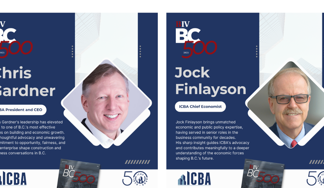 We’re proud to share that two of ICBA’s senior leaders, President & CEO Chris Gardner and Chief Economist Jock Finlayson, have been named to Business in Vancouver’s prestigious BC500 list, recognizing influential British Columbians making a notable impact on our province.
