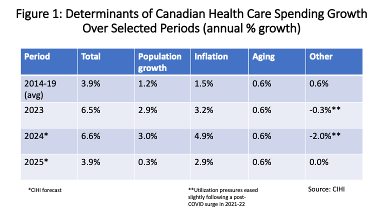 As the CIHI’s report summarizes, “Canada’s health care spending is driven by supply and demand factors including inflation, population growth, population aging and service utilization.” The various determinants of health care spending growth since 2014 are broken out in the first accompanying figure. Inflation pressures have played an outsized role in recent years. Population aging is an ongoing but slow-moving trend. No data are provided for the years 2020-2022 because of temporary disruptions and distortions caused by the COVID-19 pandemic. Utilization of health services fell in the early stages of the pandemic but then surged in the second half of 2021 through 2022 before dipping slightly in 2023-24.